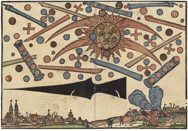 In the year 1561 there was a kind of "aerial battle" between various kinds of flying objects or UFOs over the city of Nuremberg, Germany that had many witnesses. Why were the UFOs putting up this show in the skies here at this time? [and from another] 1561 Celestial Phenomenon over Nuremberg https://en.wikipedia.org/wiki/1561_celestial_phenomenon_over_Nurember An April 1561 broadsheet by Hans Glaser described a mass sighting of celestial phenomena or unidentified flying objects (UFO) above Nuremberg (then a Free Imperial City of the Holy Roman Empire). Ufologists have speculated that these phenomena may have been extraterrestrial spacecraft. Skeptics assert that the phenomenon was likely to have been another atmospheric phenomenon, such as a sun dog, although the print does not fit the usual classic description of the phenomena.