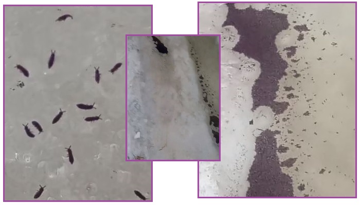 These seemingly ephemeral Snow Fleas live in air that has access to water. They are seldom seen by man as they are tiny and well disbursed but do cluster when their need for water forces them into puddles. Like cockroaches they can hibernate in cold or adverse conditions so can emerge from snow and ice unharmed.